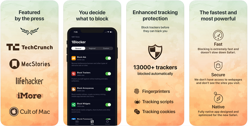 1,99 USD Free / Offers In-App Purchases / 1,9K Ratings / App Store US1Blocker for Safari là một ứng dụng chặn quảng cáo, mã theo dõi và nhiều nội dung không mong muốn khác khi duyệt web. Bao gồm các tính năng như cài đặt sẵn hơn 7000 trình khóa, giảm lưu lượng data khi duyệt web xuống còn một nửa hay nhiều hơn, giúp tốc độ tải trang nhanh hơn, dễ dàng thiết lập nội dung muốn chặn ( như ẩn thành phần của trang, chặn trang và cookies). Ngoài việc chặn quảng cáo, 1Blocker còn có thể chặn các widget mạng xã hội, nút share, font trang web, trang có nội dung người lớn v.v...