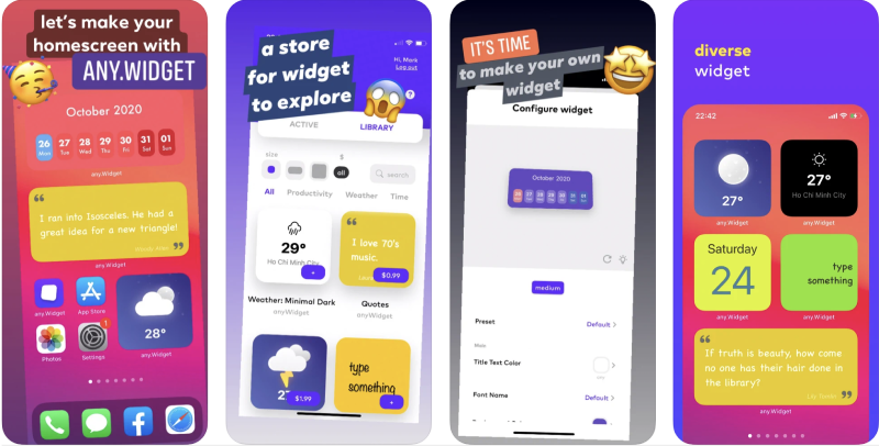 0.99 USD Free / Offers In-App Purchases / 71 Ratings/ App Store USỨng dụng này cung cấp cho bạn widget tiện ích hình ảnh, ghi chú, quote... trên màn hình chính iOS 14. Có ba kích thước widget chính là hình vuông (nhỏ), hình vuông (lớn) và hình chữ nhật để bạn chọn lựa.