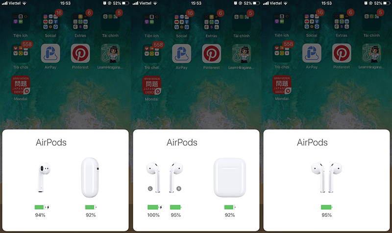 Người dùng Airpods không cần phải “dự đoán” lượng pin trong chiếc tai nghe của mình hay kiểm tra lượng pin còn lại bằng cách đóng / mở hộp sạc một cách bất tiện nữa. Với widget Battery dành riêng cho iOS (có thể được thêm vào Notification Center), người dùng có thể kiểm tra lượng pin còn lại của Airpods và hộp sạc trên giao diện thông báo của iPhone bất cứ lúc nào.