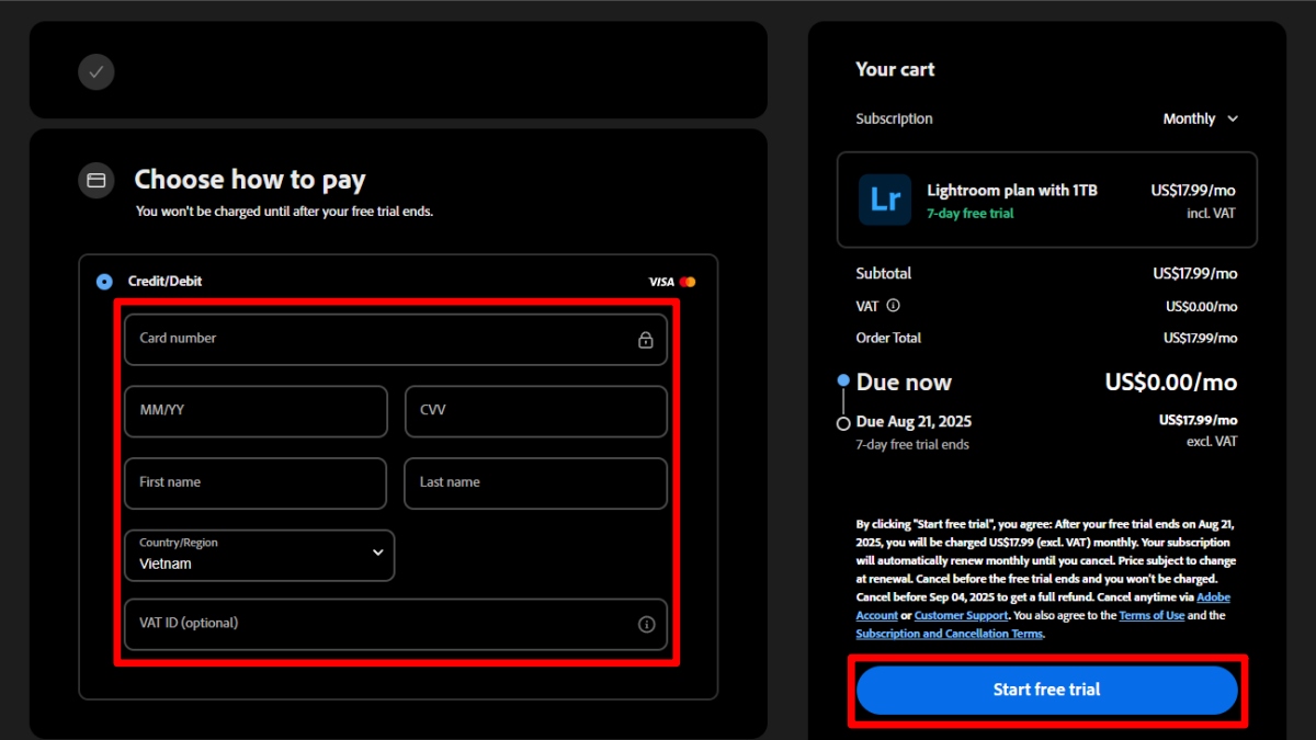 - Nhập thông tin thanh toán rồi nhấn Start free trial.