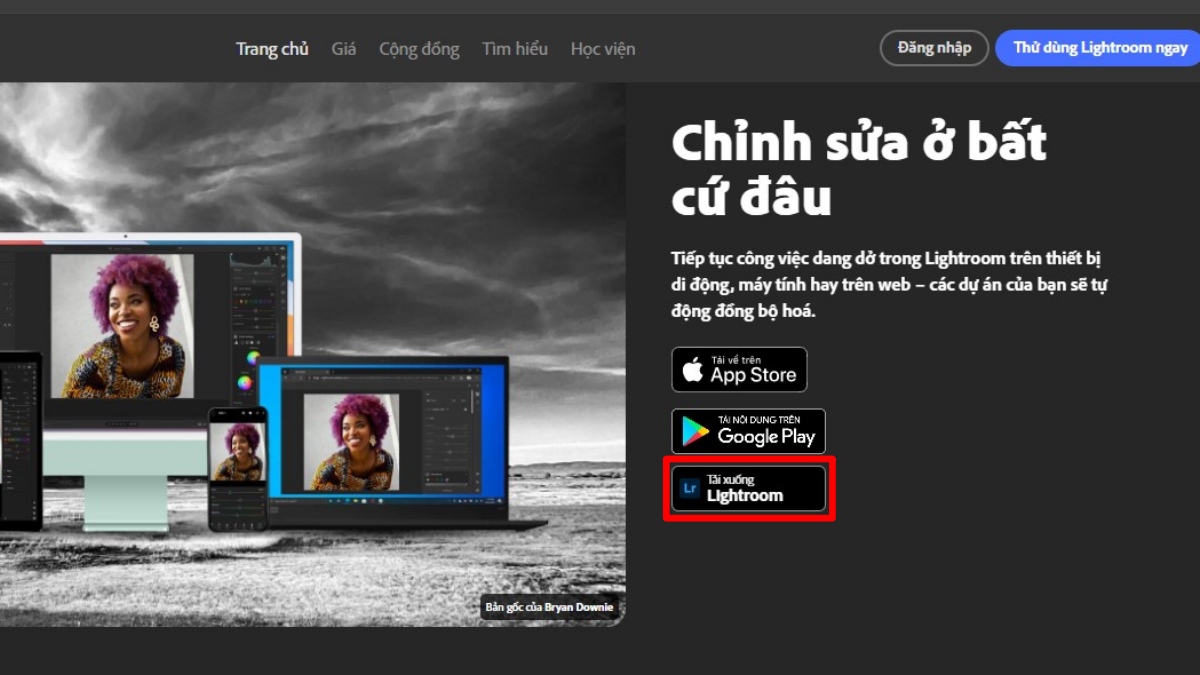 Bạn truy cập vào liên kết https://lightroom.adobe.com/. Sau đó kéo xuống cuối cùng và nhấn vào Tải xuống Lightroom.