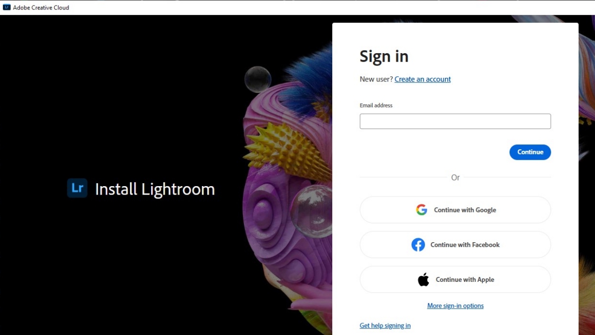 Bạn nhấn click chuột vào file cài đặt mới tải về máy (lưu ý đây là file có đầy đủ công cụ Adobe). Sau đó bạn đăng nhập bằng email, Facebook hay tài khoản Apple.