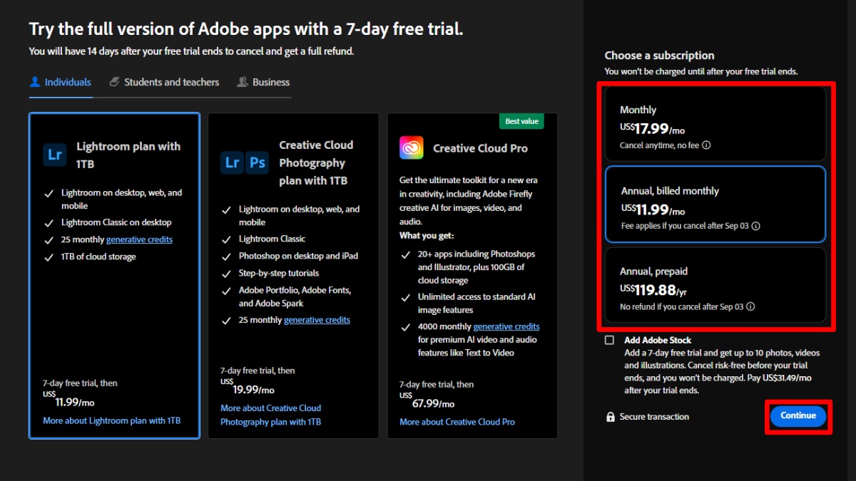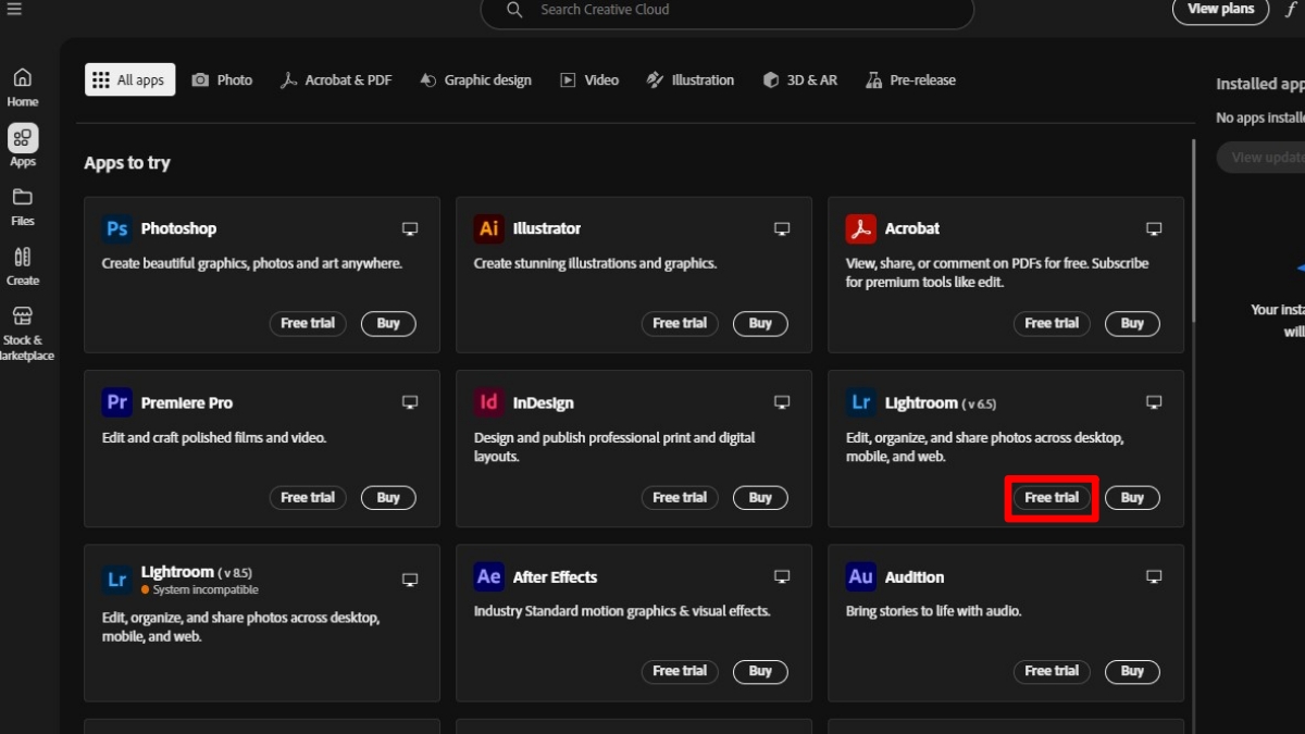 - Nhấn vào App và chọn Free Trial ở mục Lightroom.