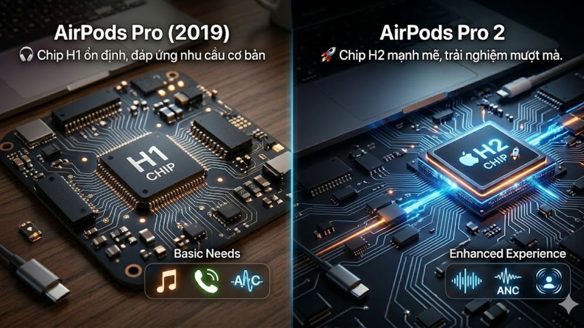 Khi so sánh AirPods Pro và AirPods Pro 2 về chip xử lý, điểm khác biệt dễ nhận thấy là thế hệ chip được Apple nâng cấp qua từng phiên bản. AirPods Pro (2019) dùng chip H1, vẫn đáp ứng ổn định các nhu cầu nghe nhạc, gọi điện và chống ồn cơ bản.