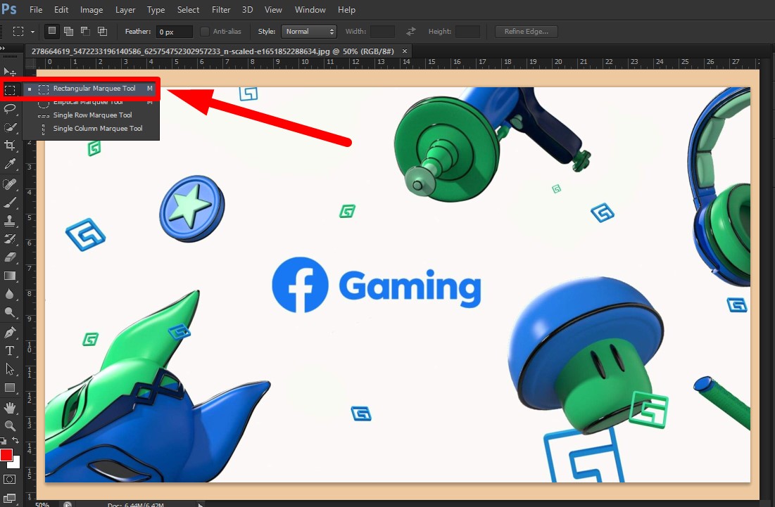 Bước 2: Tiếp theo, ở trên giao diện chính thì bạn nhấp chọn vào biểu tượng có hình ô vuông có nét đứt Click chọn Rectangular Marquee Tool hoặc ấn phím M để công cụ khoanh vùng được kích hoạt.