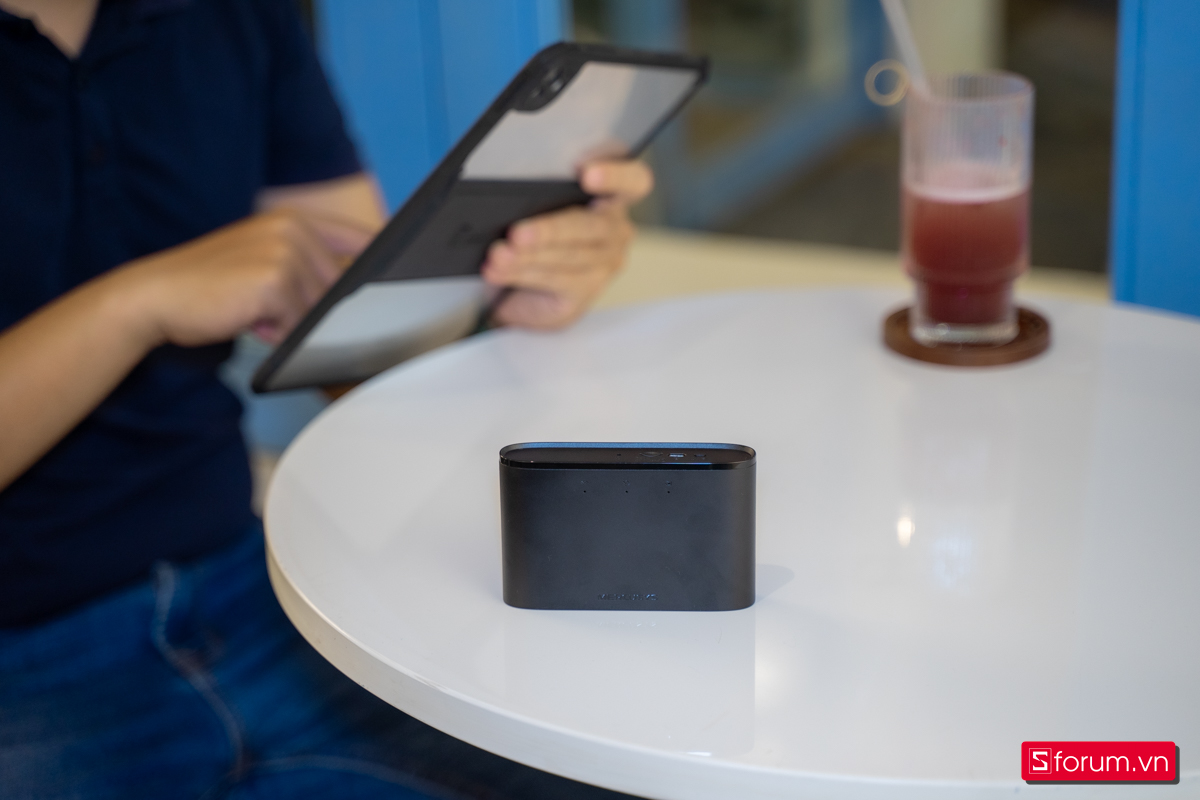 Thiết bị có độ phủ sóng khoảng 10 đến 15m, đủ dùng trong phòng khách homestay, quán cà phê hoặc khi cả nhóm ngồi nghỉ chân tại điểm du lịch. Khe cắm microSD (tối đa 32GB) cũng là điểm cộng, cho phép chia sẻ dữ liệu nội bộ giữa các thiết bị nếu cần.
