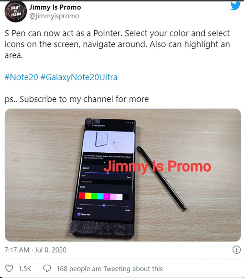 Theo đó, leaker được nhắc tới ở trên có tên tài khoản trên Twitter là @jimmyispromo. Theo bức ảnh mà người này đăng tải thì chiếc S Pen thế hệ mới có thiết kế không khác mấy so với các phiên bản trước nhưng nó đi kèm với một tính năng phần mềm mới cho phép sử dụng như một con trỏ trên máy tính.
