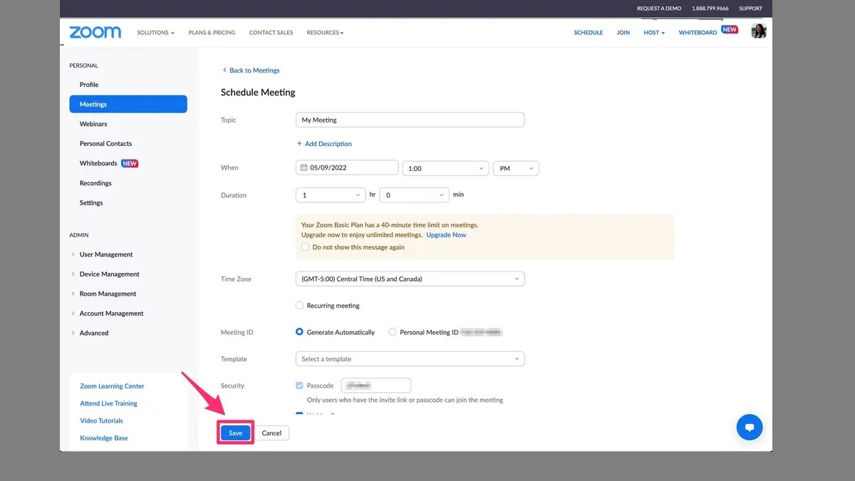 Bước 3: Điền các thông tin cần thiết trong mục “Schedule a Meeting”. Những thông tin cơ bản bao gồm: tiêu đề, thời gian họp, thời lượng, múi giờ, lên lịch định kỳ, tùy chọn khác...