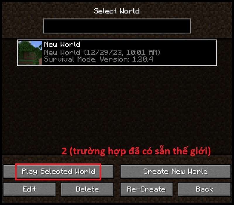 - Bước 1: Đầu tiên, vào Minecraft và chờ màn hình chính xuất hiện. Sau đó nhấn vào Singleplayer (chế độ một người chơi). Tiếp tục mở world muốn chơi.