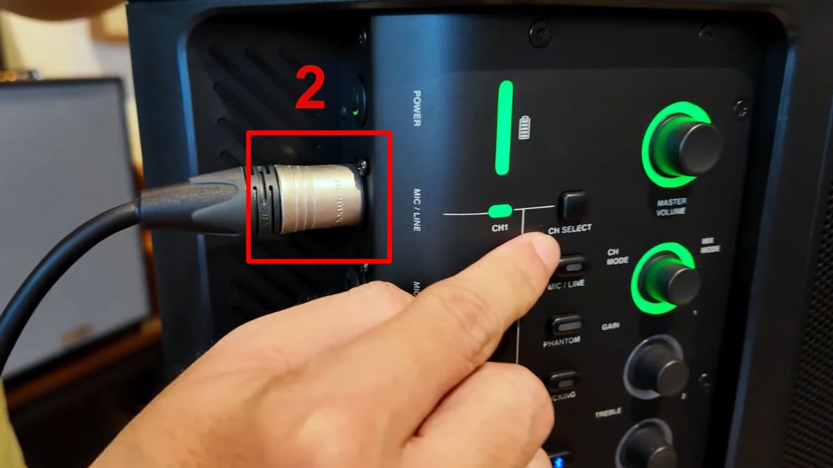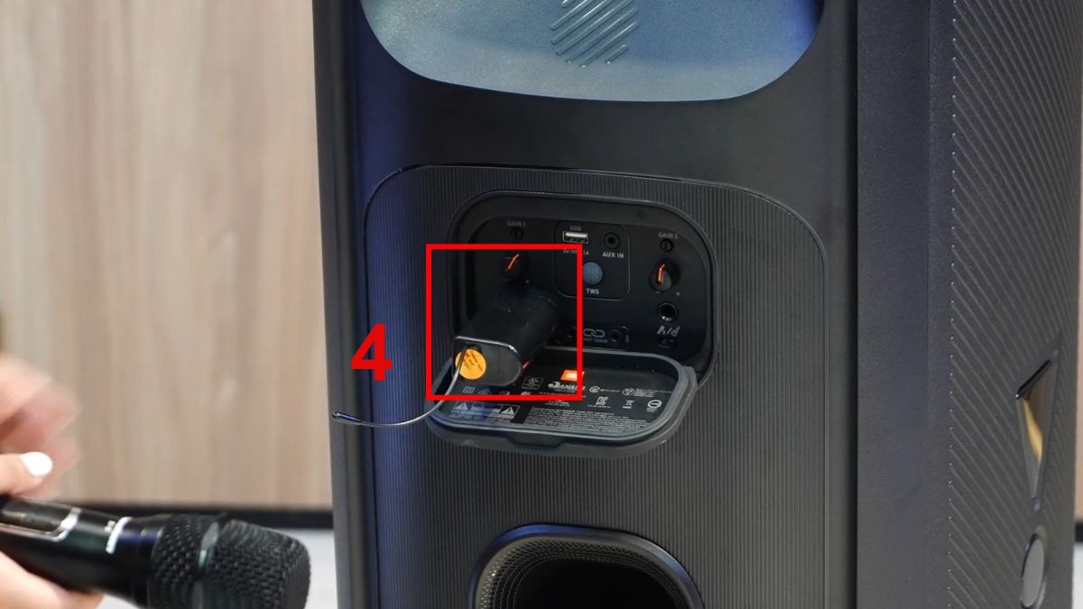 - Bước 2: Cắm jack micro vào cổng MIC trên loa JBL và đảm bảo kết nối chắc chắn.