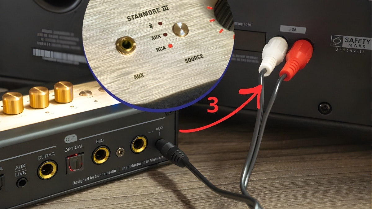 Với dây RCA: Cắm đầu AUX (3.5mm) từ cổng Out trên vang số sang cổng RCA (Input) của loa, sau đó chọn đúng nguồn vào RCA trên loa Marshall.
