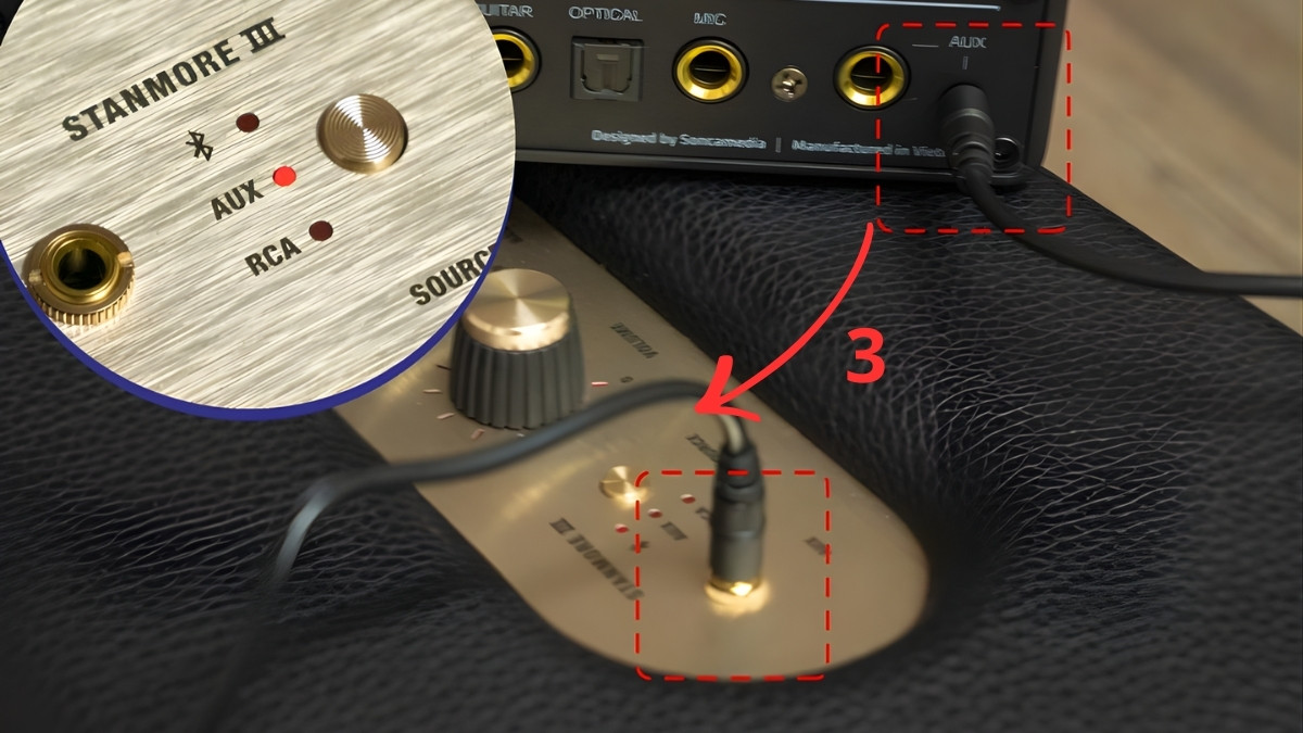 - Bước 3: Cắm dây AUX từ AUX Out bộ thu vào AUX In loa Marshall (hoặc RCA nếu loa hỗ trợ), nhấn nút Source chọn AUX/RCA.