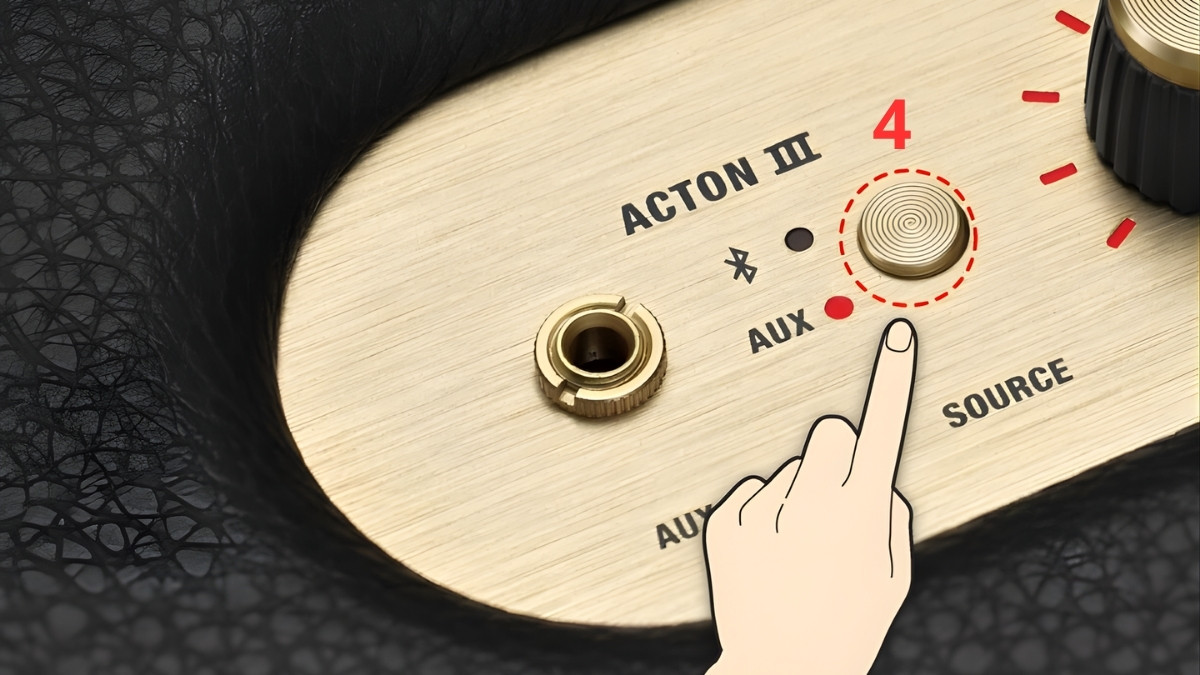 - Bước 4: Bật loa Marshall, nhấn nút Source, chọn AUX/RCA, điều chỉnh volume và echo trên vang để tránh hú.