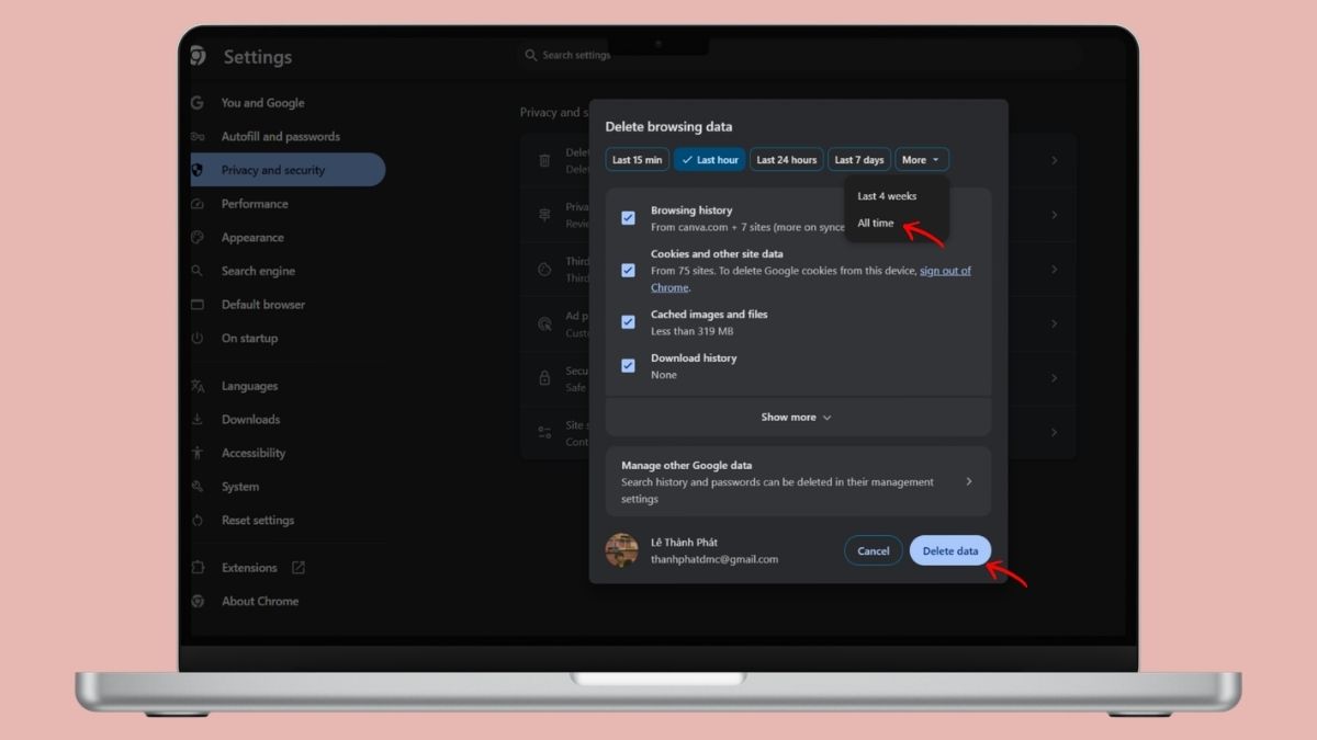 Nhấn vào "All time" và chọn “Delete data” là hoàn tất.