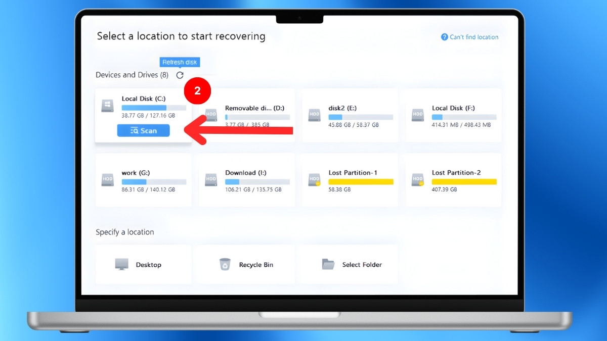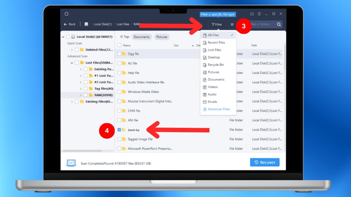 - Click vào Scan (Quét) để phần mềm tìm kiếm các tệp đã xóa theo ổ đĩa đã chọn.
