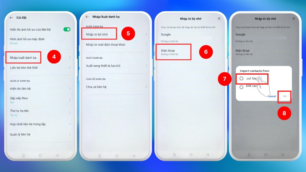 Nếu bạn đã từng sao lưu danh bạ bằng file VCF, thì đây là cách khôi phục danh bạ trên OPPO nhanh, dễ dàng thực hiện và không cần đến phần mềm ngoài.