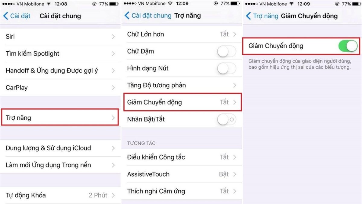 - Vào “Cài đặt” đi đến “cài đặt chung” “trợ năng” gạt cần để bật tính năng “giảm chuyển động”.