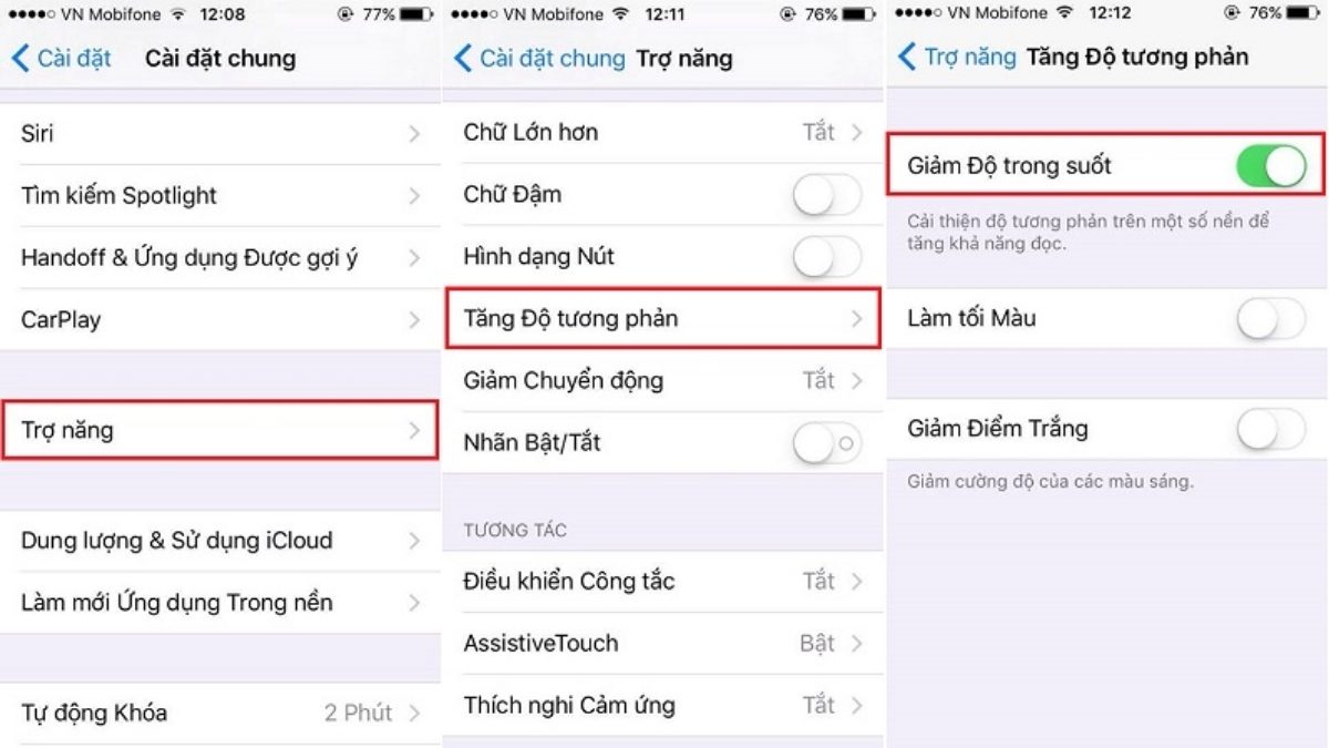 - Mở “cài đặt” trên iPhone “cài đặt chung” “trợ năng” nhấp vào mục “Độ tương phản” bật tính năng “giảm độ trong suốt”.