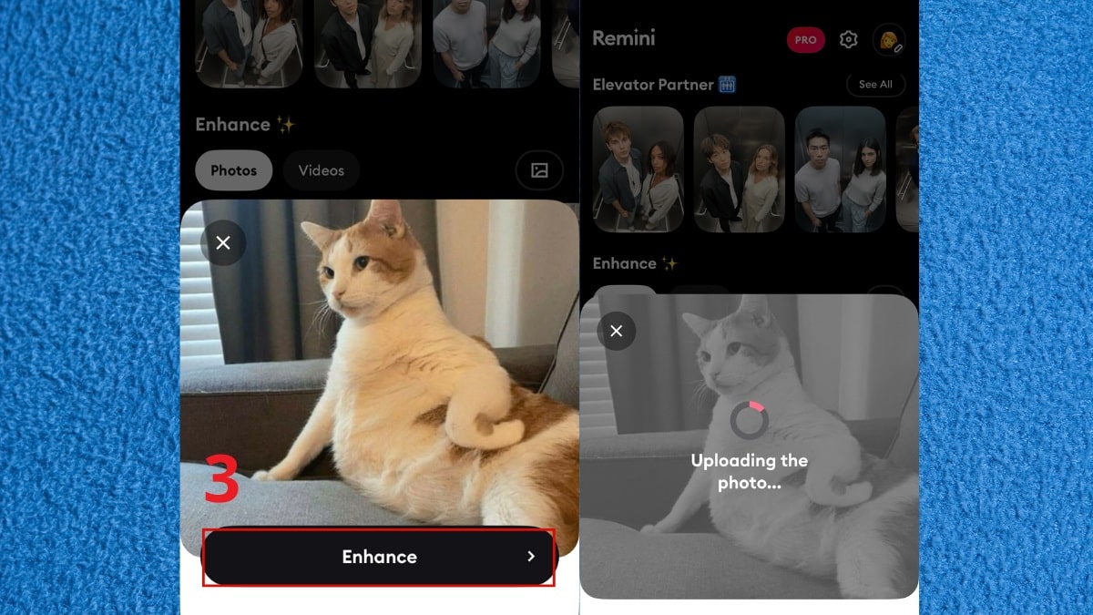 Khi đã chọn ảnh xong, hãy Click vào “Enhance”. Remini sẽ bắt đầu làm nét ảnh, bạn có thể đăng ký bản pro hoặc xem quảng cáo để bắt đầu làm rõ.