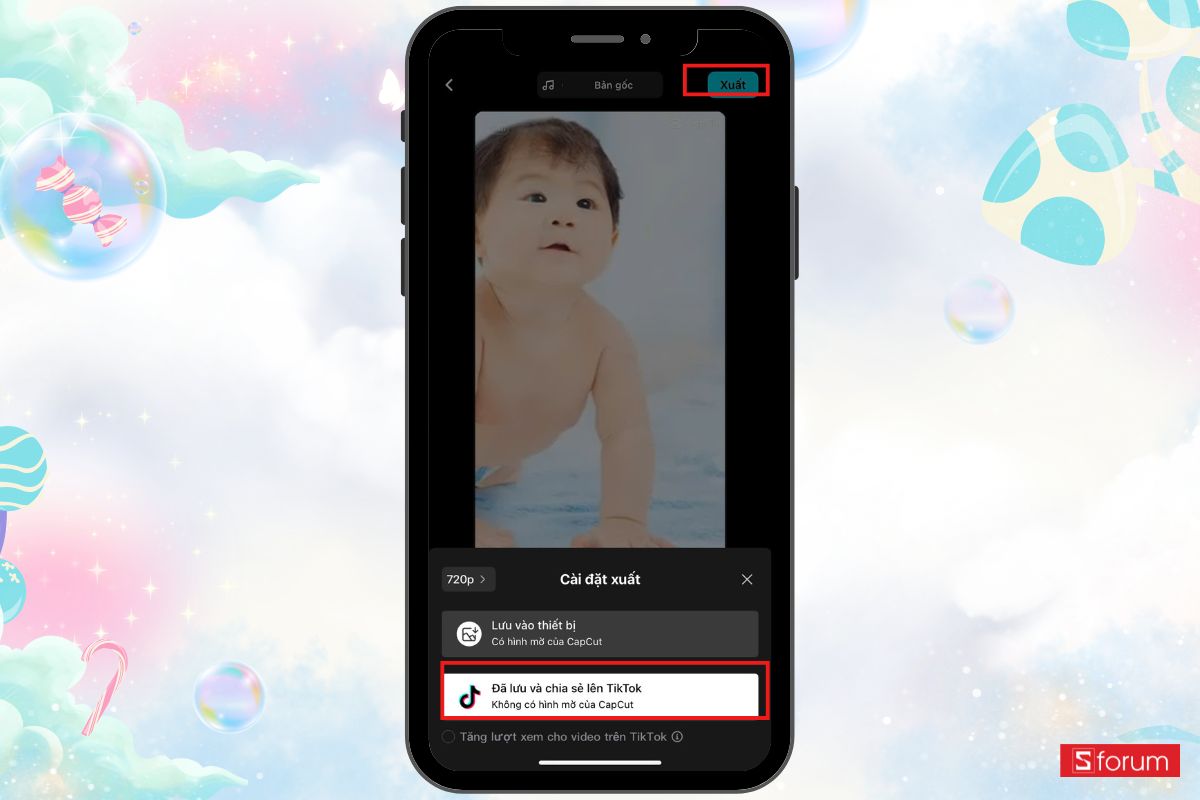 Bước 4: Xem trước kết quả để đảm bảo mặt không bị lỗi, sau đó nhấn "Xuất (Export)" và chọn "Lưu và chia sẻ lên TikTok" để xóa logo capcut miễn phí.