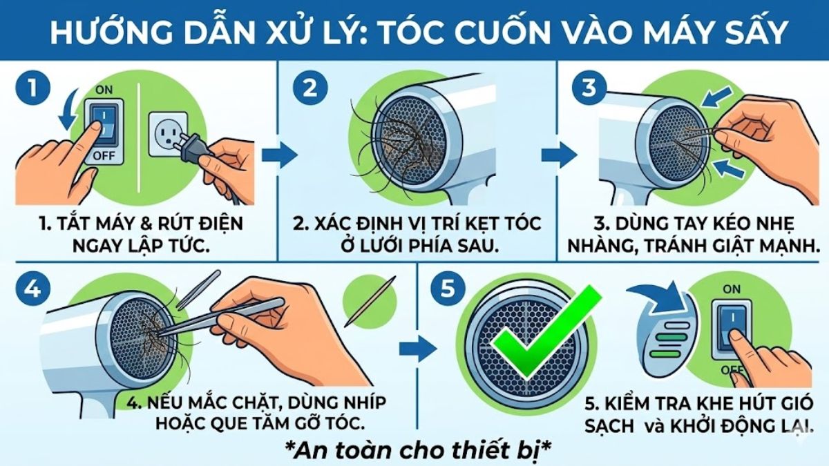 Sforum vừa cho bạn biết tóc bị cuốn vào máy sấy có sao không và có gây hại gì không. Ngoài ra, còn đề cập các cách lấy tóc ra khỏi máy sấy hiệu quả. Việc tắt máy, rút điện và gỡ tóc nhẹ nhàng sẽ giúp tránh làm hỏng quạt hút hoặc các bộ phận bên trong máy sấy. Theo dõi Sforum để cập nhật thêm nhiều kiến thức gia dụng hữu ích!