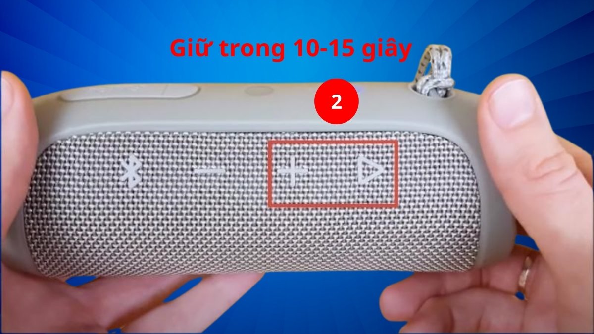 - Bước 2: Nhấn giữ nút Play và Tăng âm lượng (+) cùng lúc > Giữ 10-15 giây cho đến khi loa tự tắt.
