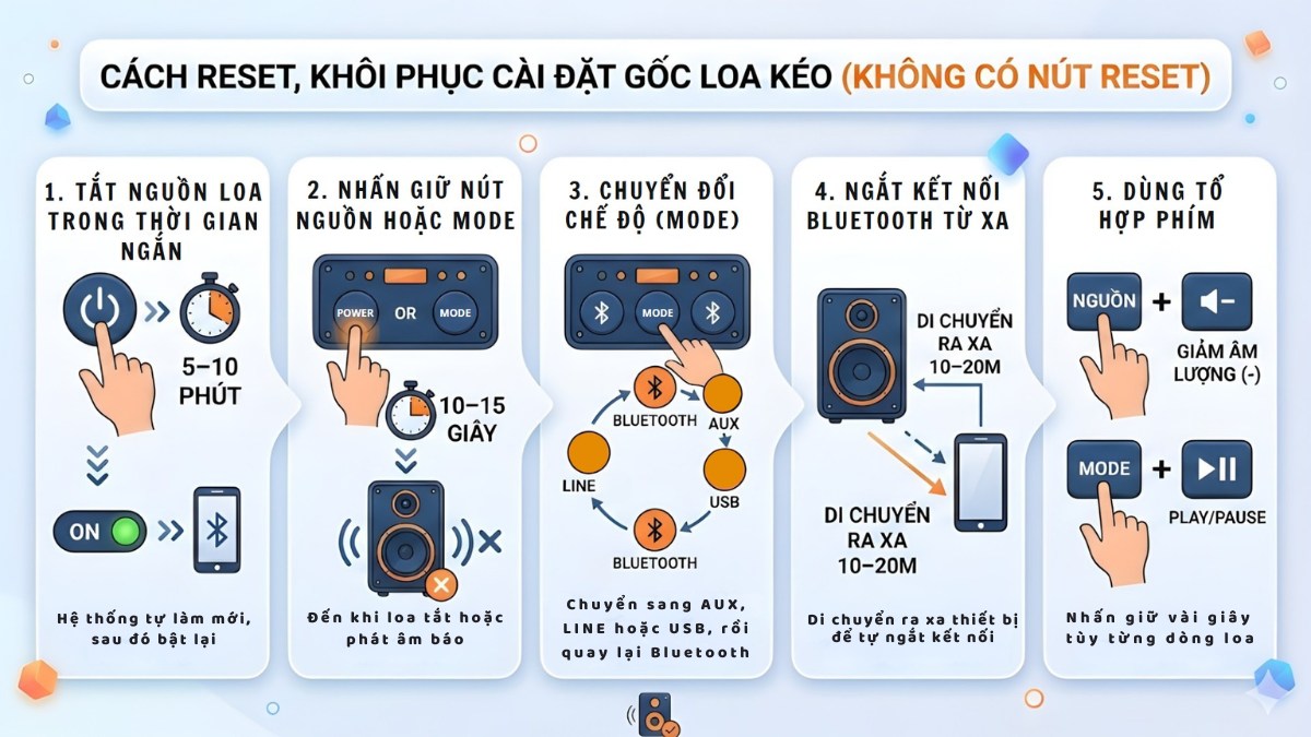 - Dùng tổ hợp phím: Tùy từng dòng loa, nhấn giữ Nguồn + Giảm âm lượng (-) hoặc Mode + Play/Pause vài giây để thực hiện khôi phục loa kéo.