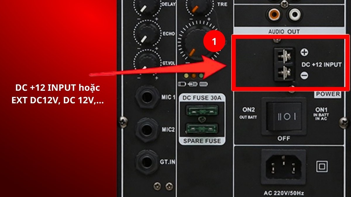 - Bước 1: Kiểm tra vị trí cổng cấp nguồn DC trên loa kéo, thường được ghi chú là DC +12 INPUT hoặc EXT DC12V, DC 12V,...trên bảng kết nối phía sau loa.
