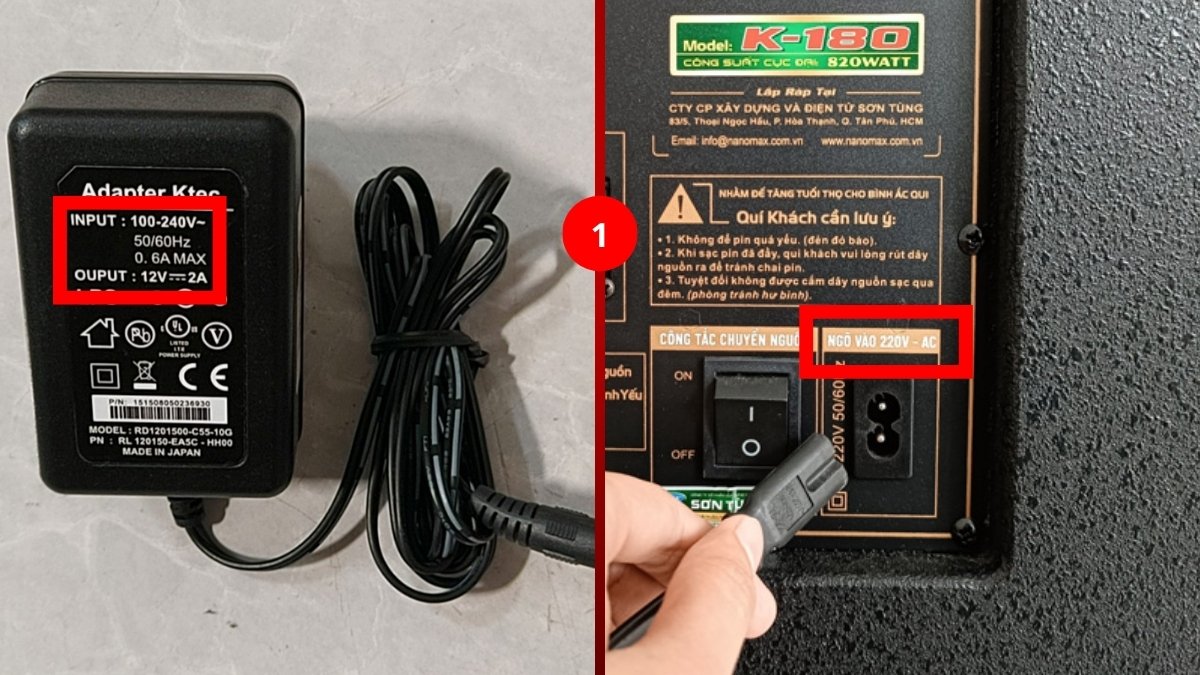 - Bước 1: Chọn adapter sạc đúng điện áp và dòng điện theo thông số kỹ thuật được ghi trên loa.