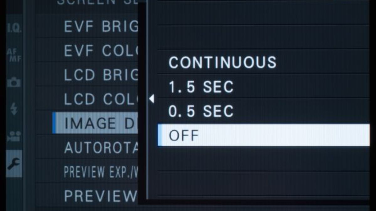 Những lựa chọn như 0.5 sec hay 1.5 sec rất hợp lý cho các trường hợp chụp bình thường. Nhưng nếu bạn đang dùng tripod để chụp, bạn có thể chọn Chụp Liên tục. Tùy chọn này sẽ hiển thị ảnh ngay sau khi bạn chụp và tự động tắt khi bạn nhấn nút chụp. Bạn có thể tìm thấy các tùy chọn này trong phần menu SetupScreen Settings.