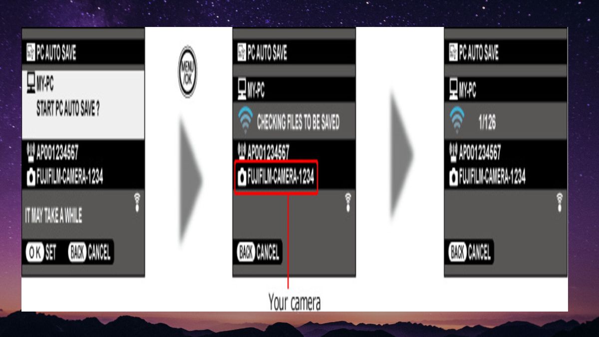 Bước 4: Tiến hành thao táctự động kết nối máy ảnh.Bước 5: Lúc này, máy ảnh sẽ xuất hiện mộthộp thoại xác nhận. Nhấn Menu để có thể bắt đầu tải lên trực tiếp.