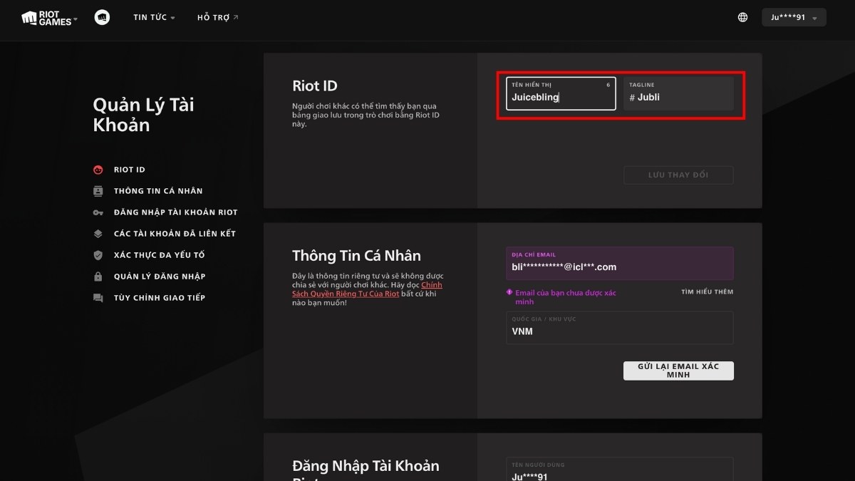 Bước 2: Chỉnh sửa các thông tin như: Riot ID (tên hiển thị trong game), khẩu hiệu cá nhân, địa chỉ email, ngày sinh,...