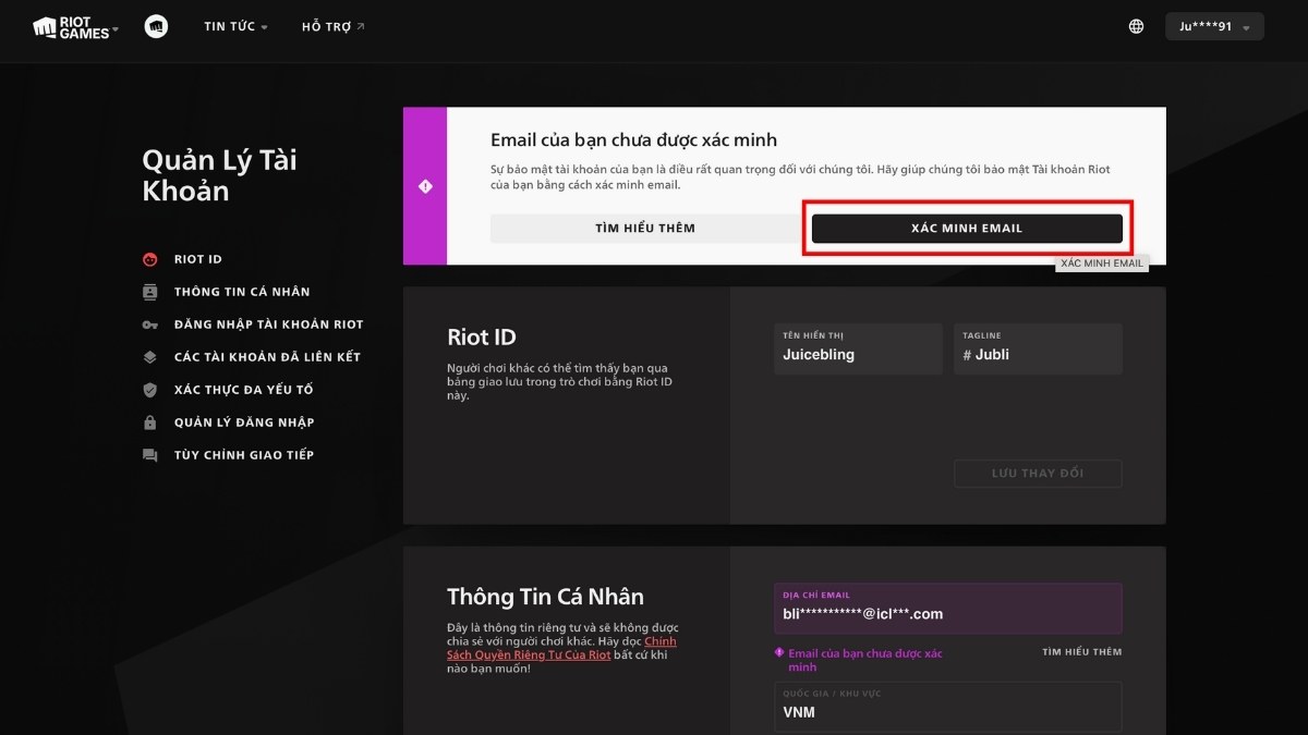 - Xác minh địa chỉ email: Sau khi tải Riot Client cho PC và đăng nhập, hãy kiểm tra xem email liên kết đã được xác thực hay chưa để tăng độ an toàn.
