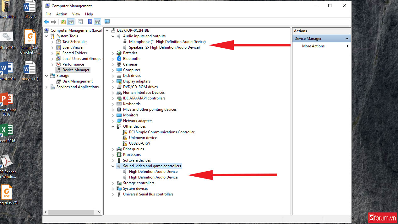 Bước 2:Mở mục “Device Manager” và nhấp đúp chuột vào 2 mục “Audio inputs and outputs” và “Sound, video and game controllers”. Bây giờ hãy kiểm tra xem có driver nào bị dấu chấm than vàng hay dấu “X” màu đỏ hay không? Nếu có tức là driver đó đã bị thiếu và bạn cần phải thêm driver đó vào máy tính.
