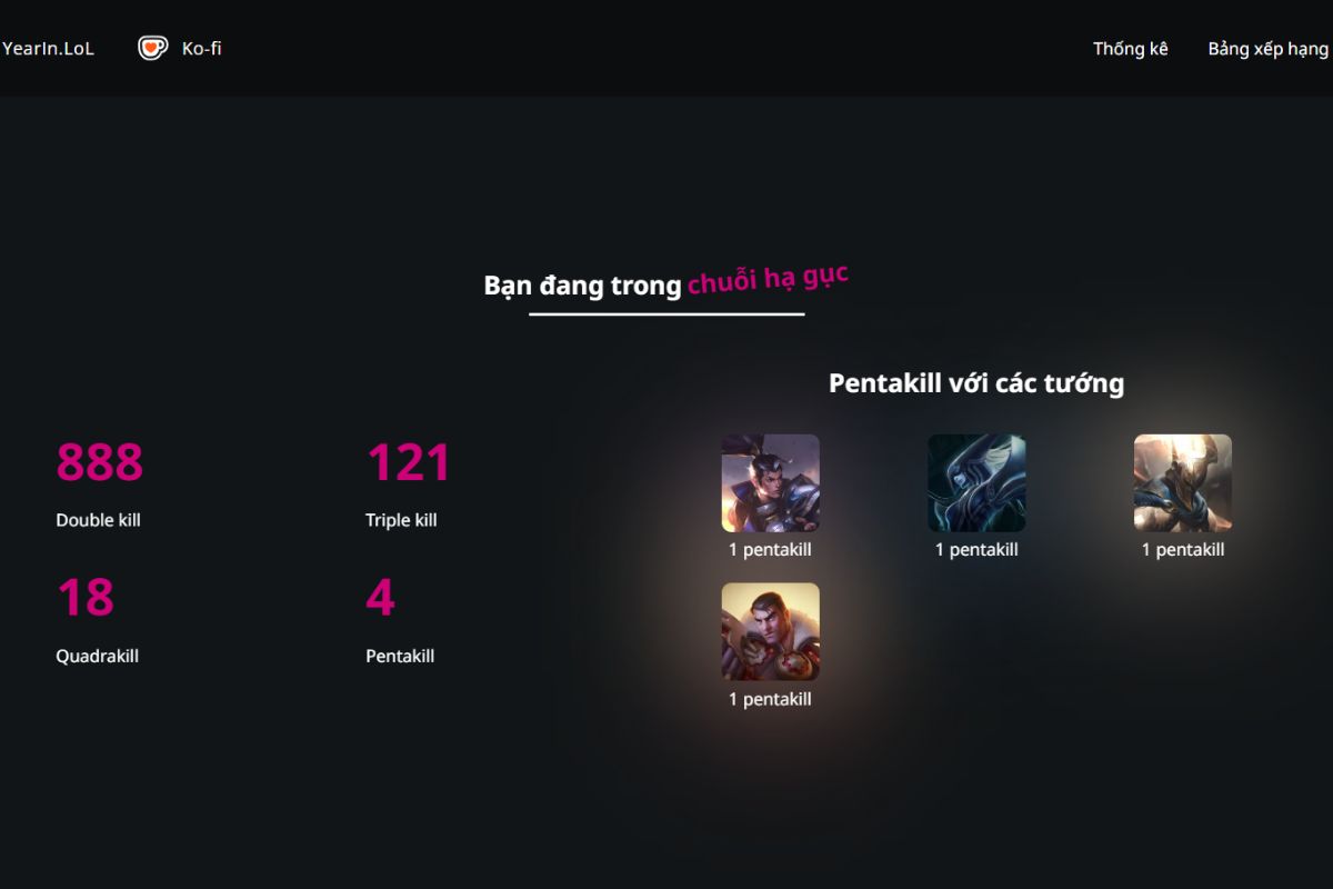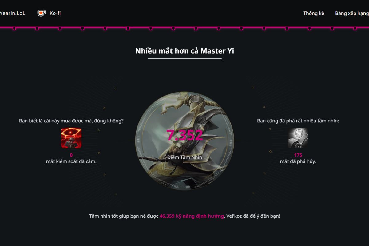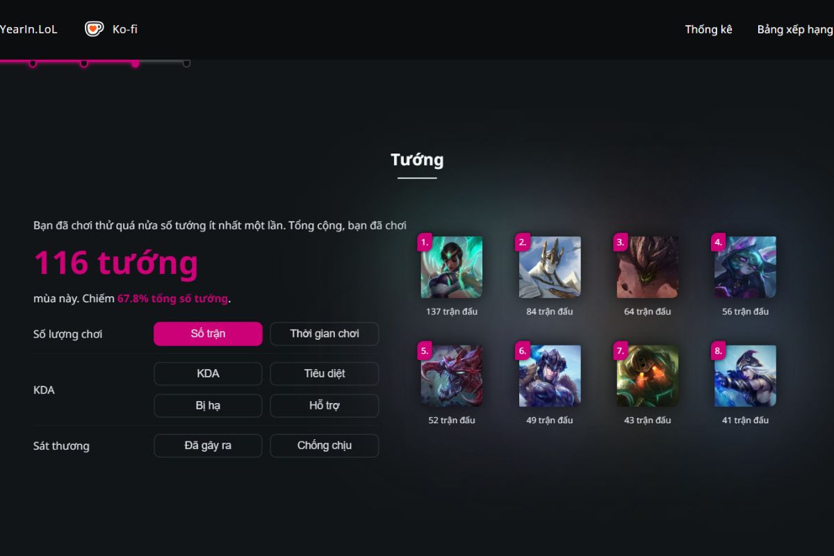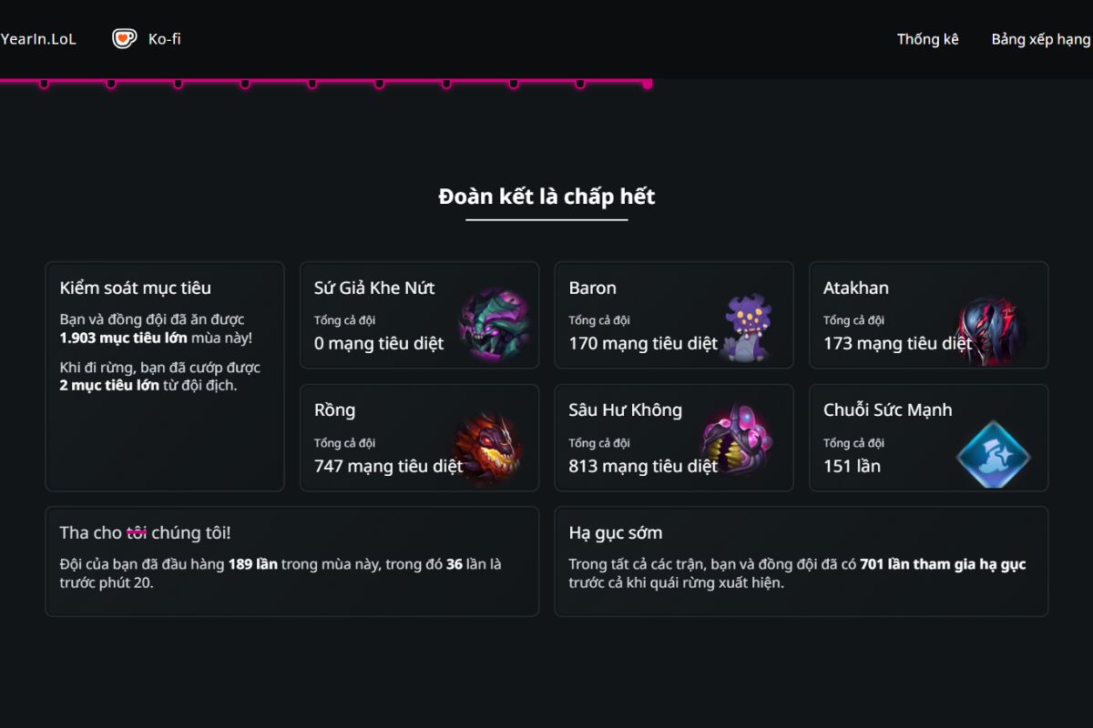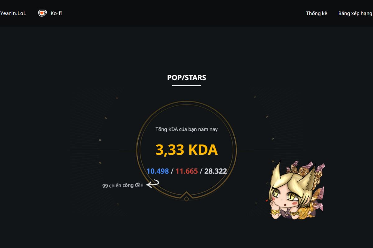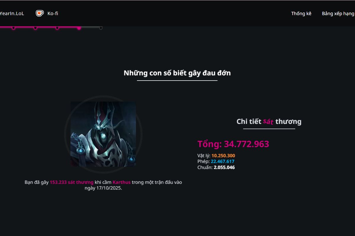 - Chỉ số thi đấu cá nhân: Bao gồm số mạng hạ gục, số lần bị hạ gục, hỗ trợ, KDA trung bình, lượng sát thương gây ra và lượng vàng kiếm được trong suốt năm.