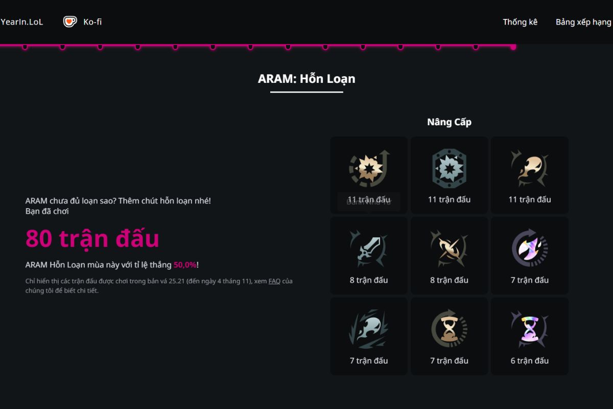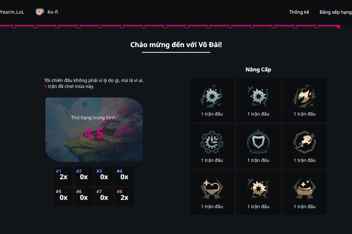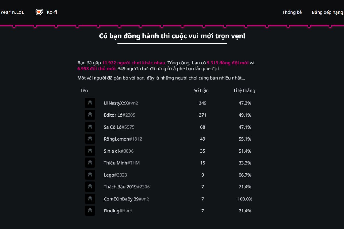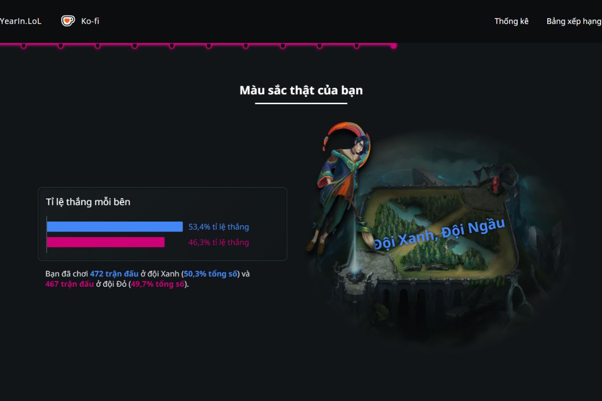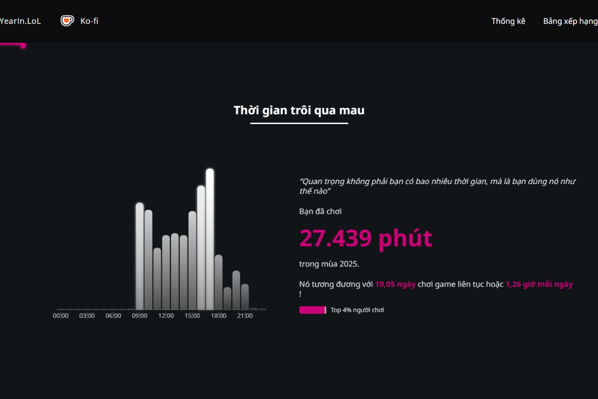 - Tổng quan thời gian chơi: Thống kê tổng số trận đã tham gia, tổng số giờ chơi trong năm và mức độ hoạt động theo từng giai đoạn, giúp bạn hình dung rõ mức độ gắn bó của mình với LMHT.