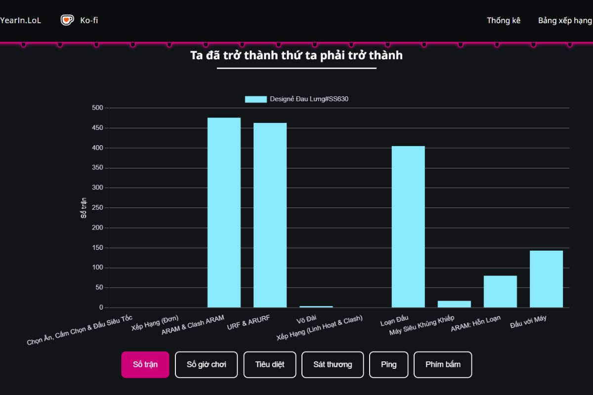 - Phân bố chế độ chơi: Thể hiện tỷ lệ thời gian bạn dành cho các chế độ như xếp hạng đơn/đôi, đấu thường, ARAM hoặc các chế độ sự kiện, từ đó phản ánh thói quen chơi game chủ đạo.