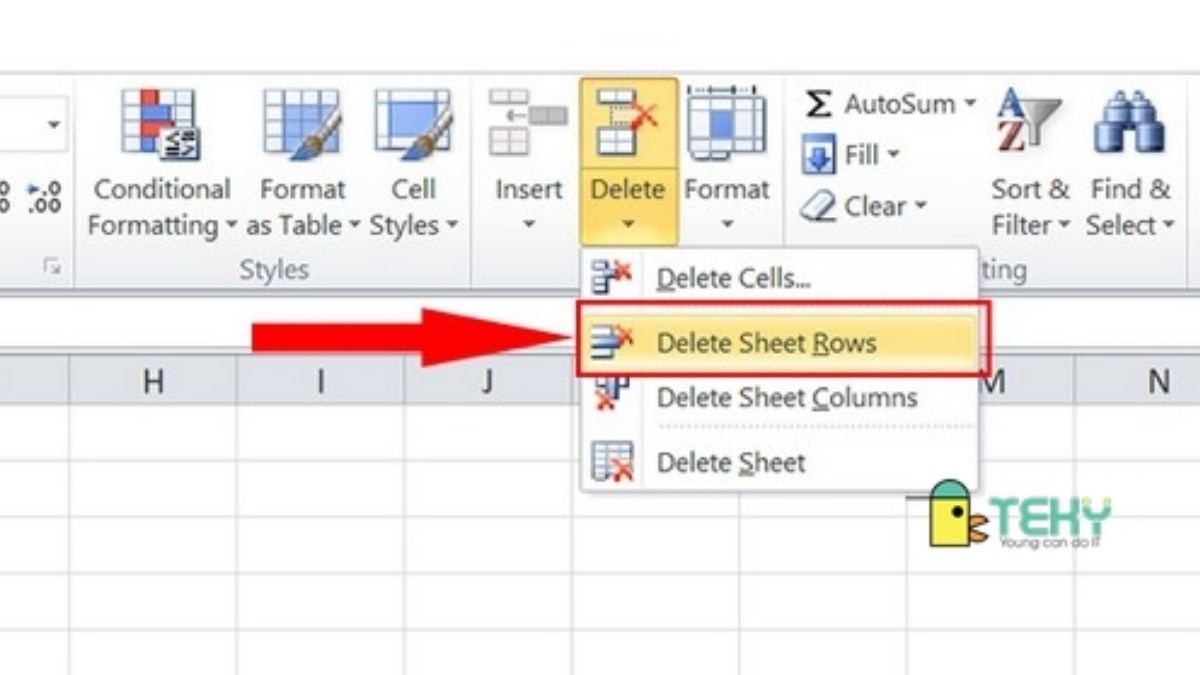 Bước 5: Trên thanh công cụ, chọn tab 'Home' và trong nhóm 'Editing', chọn 'Delete'. Tiếp theo, chọn 'Delete Sheet Rows' (Xóa hàng trong sheet) để xóa các ô trống trong bảng Excel. Bạn cũng có thể chuột phải vào các hàng chứa ô trống và chọn 'Delete Row' (Xóa hàng) để thực hiện tương tự.