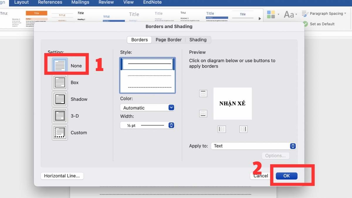 - Bước 3: Tiếp tục vào tiểu mục “Page Background” và chọn “Page Border”. Tại giao diện “Borders and Shading”, bạn chọn vào “Borders', sau đó chọn “None' trong “Setting'. Và nhấn chọn “Ok' để hoàn tất cách xóa dòng kẻ đỏ mặc định này.