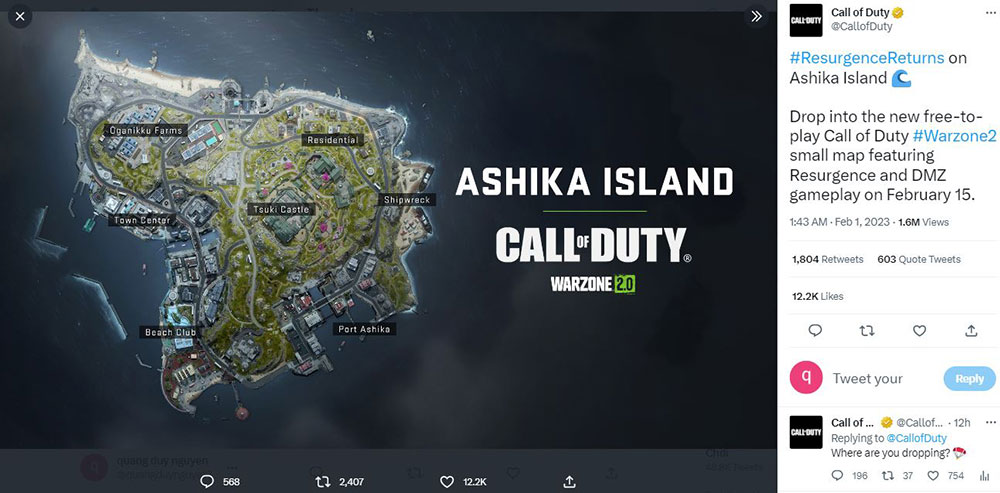 Ngày hôm qua (31/01), bản đồ Ashika đã được bật mí toàn bộ bởi chính trang Twitter của Call of Duty. Theo đó, đây là bản đồ được thiết kế dành riêng cho hai chế độ là Resurgence và DMZ. Tuy không có dữ liệu chính xác nhưng nhiều game thủ dự đoán nó sẽ có diện tích ngang ngửa với Rebirth Island và Fortune's Keep.