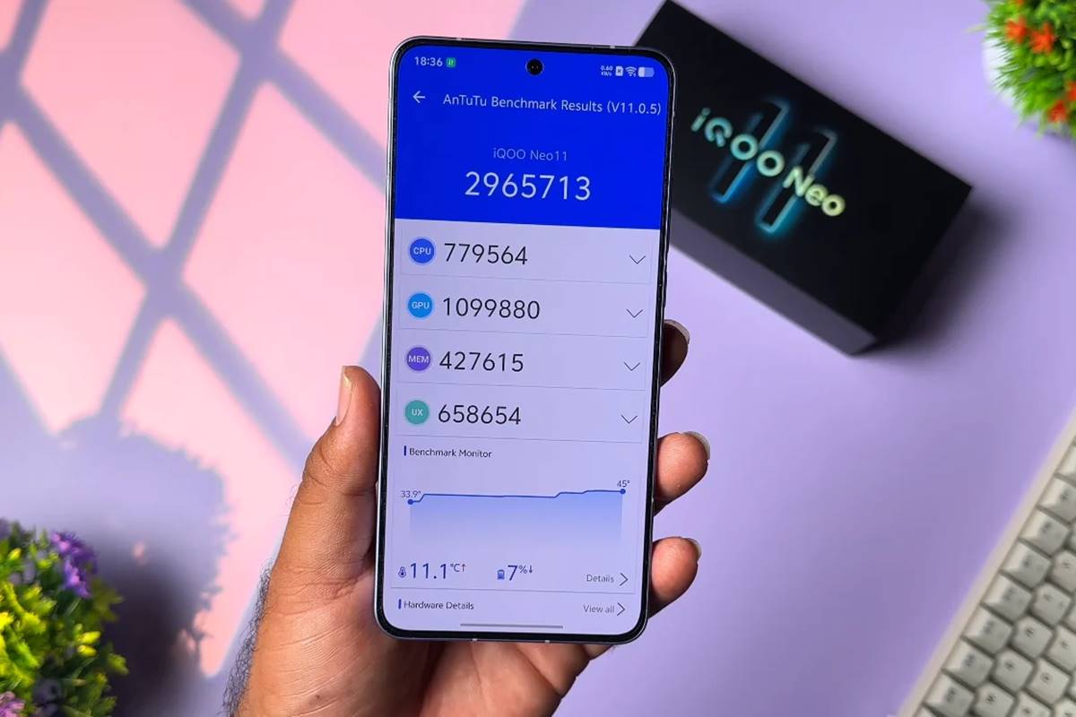 Trên thực tế, khi đo bằng AnTuTu Benchmark thì iqoo Neo 11 đạt khoảng 3 triệu điểm. Các tựa game như PUBG Mobile, Genshin Impact hay Honkai: Star Rail đều được Neo 11 xử lý dễ dàng ở mức đồ họa cao mà vẫn duy trì nhiệt độ ổn định.