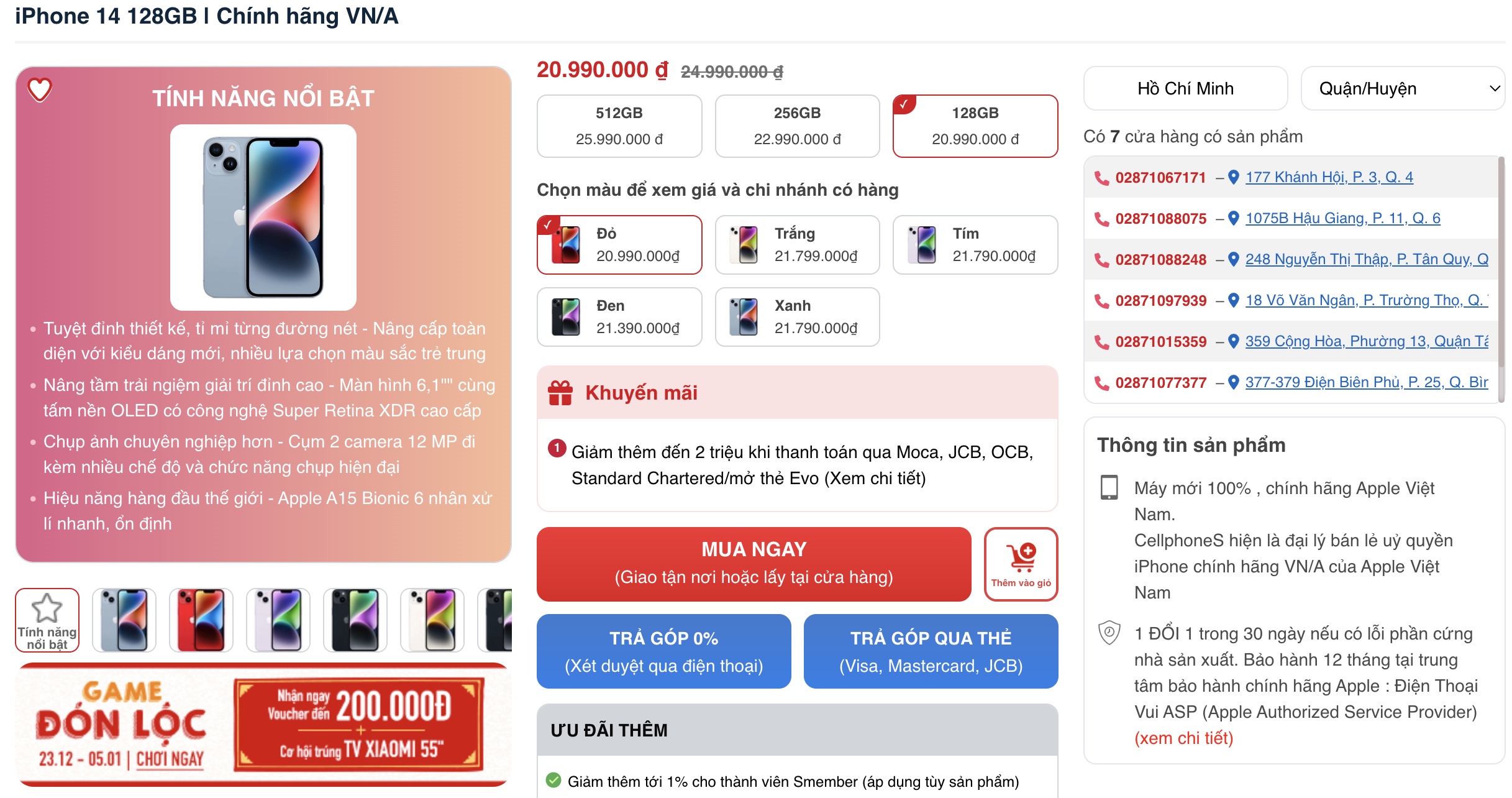 Bên cạnh đó, để kích cầu mua sắm dịp cuối năm, hệ thống CellphoneS đã điều chỉnh giá iPhone 14 series về một mức giá phù hợp và “dễ thở” hơn, khởi điểm chỉ từ 20.99 triệu đồng, tức rẻ hơn tới 4 triệu so với giá niêm yết.Hãy cùng Sforum cập nhật giá của iPhone 14 series trong dịp cận Tết này nhé: