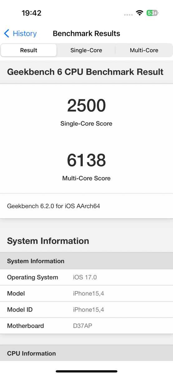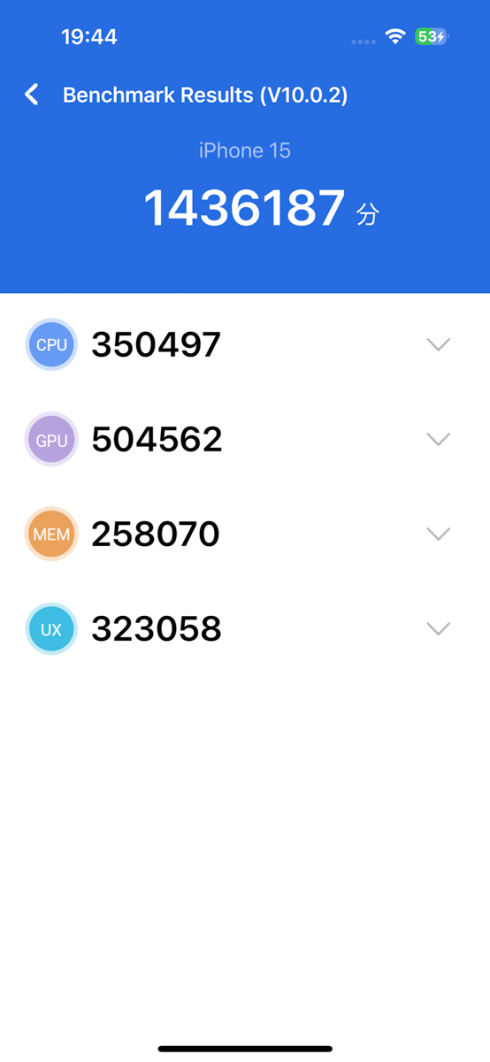 Thử nghiệm trên các phần mềm benchmark cho thấy, iPhone 15 đạt 1.43 triệu điểm trên phần mềm AnTuTu Benchmark. Còn trên phần mềm Geekbench 6, iPhone 15 xuất sắc ghi được 2,500 điểm đơn nhân và 6,138 điểm đa nhân.