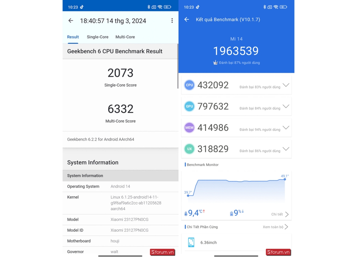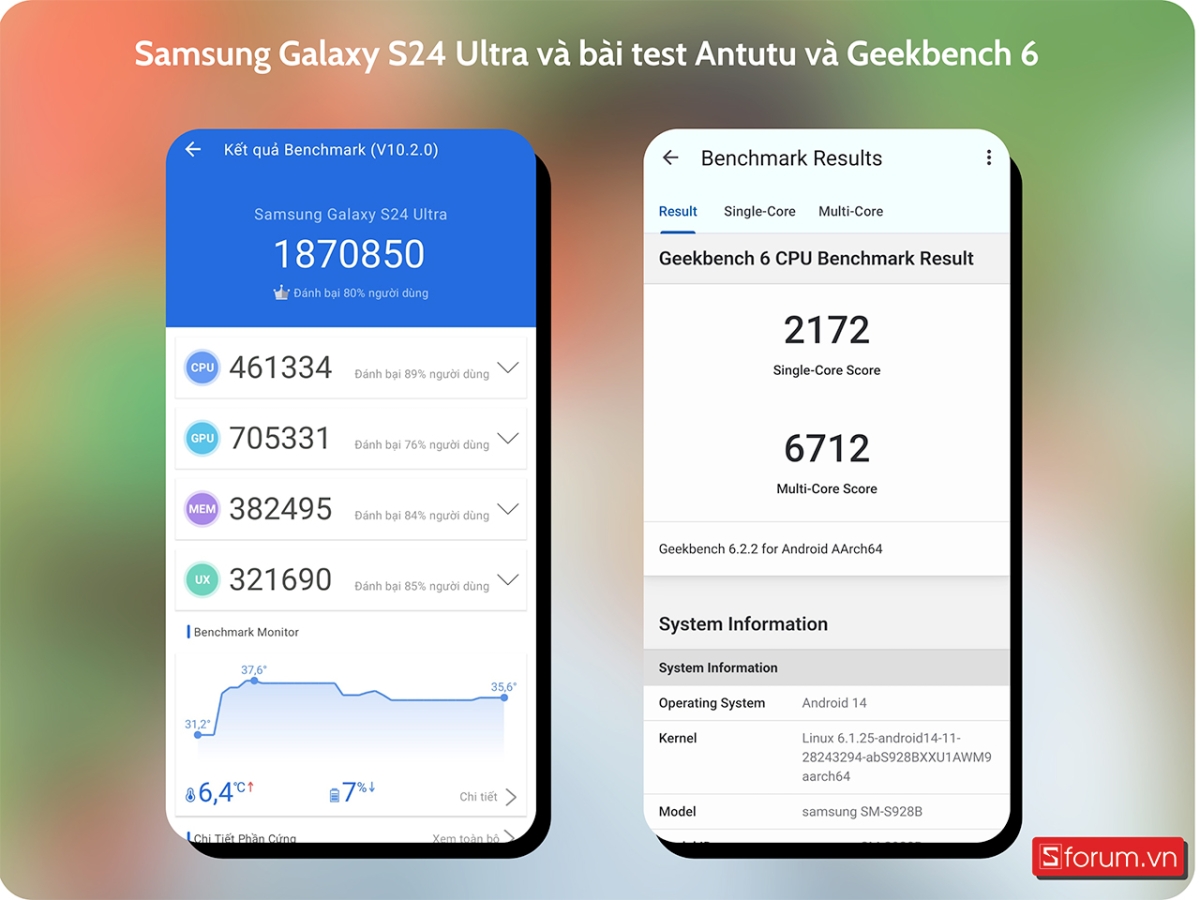 - Geekbench 6: 2,966 điểm đơn nhân và 7,512 điểm đa nhân.