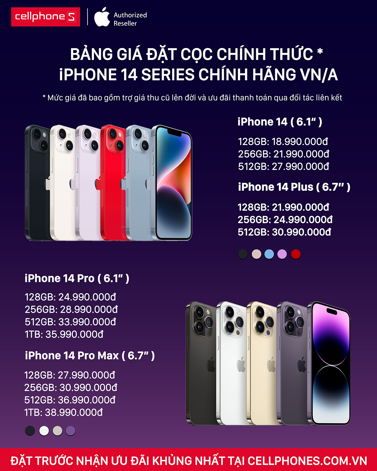 Mọi chi tiết ưu đãi, khách hàng vui lòng liên hệ 1800.2097 để được tư vấn và hỗ trợ. Số lượng và thời gian đặt hàng trước chỉ có hạn, vì vậy, hãy nhanh tay đặt trước siêu phẩm iPhone 14 series để hưởng những ưu đãi tốt nhất đến từ CellphoneS.