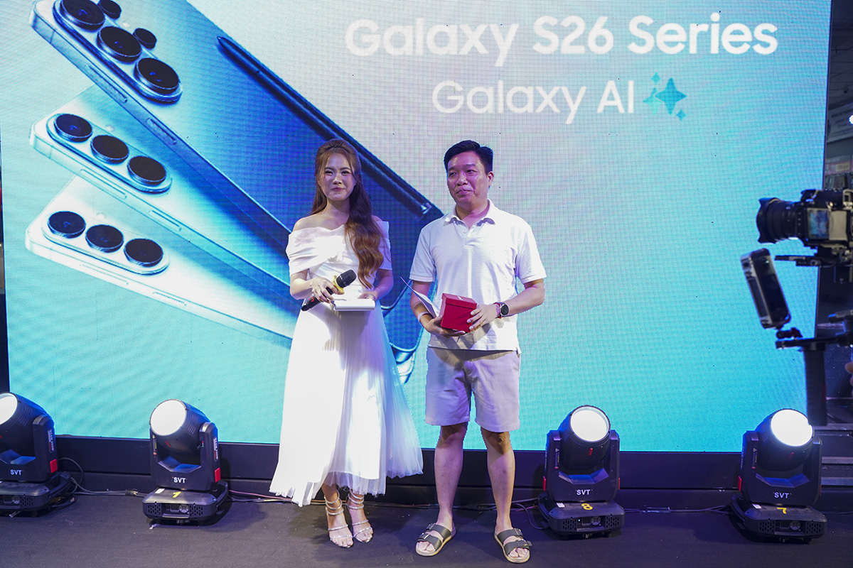Ngay sau đó, MC giới thiệu chương trình cũng như bộ ba siêu phẩm Galaxy S26, S26 Plus và S26 Ultra. Chương trình cũng mang đến minigame may mắn với mang đến những phần quà hấp dẫn cho 3 vị khách may mắn nhất trong đêm qua.