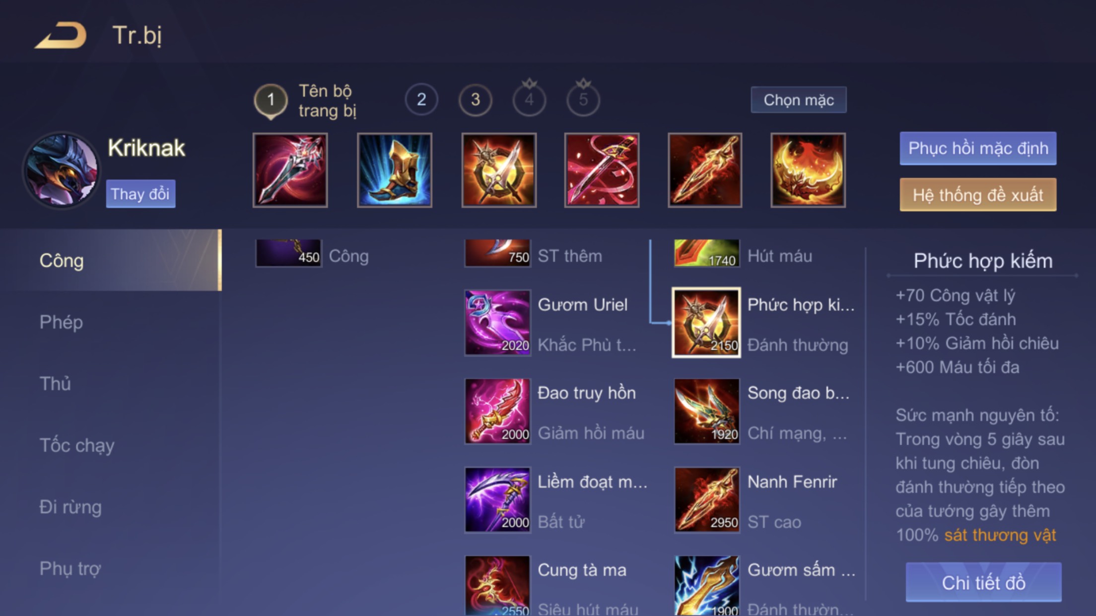 Game thủ có thể tham khảo lối lên đồ cho vị tướng Kriknak này ở mùa giải 21 như sau: Kiếm Truy Hồn, Giày Kiên Cường, Phức Hợp Kiếm, Kiếm Muramasa, Nanh Fenrir và món cuối cùng là Giáp Hộ Mệnh.