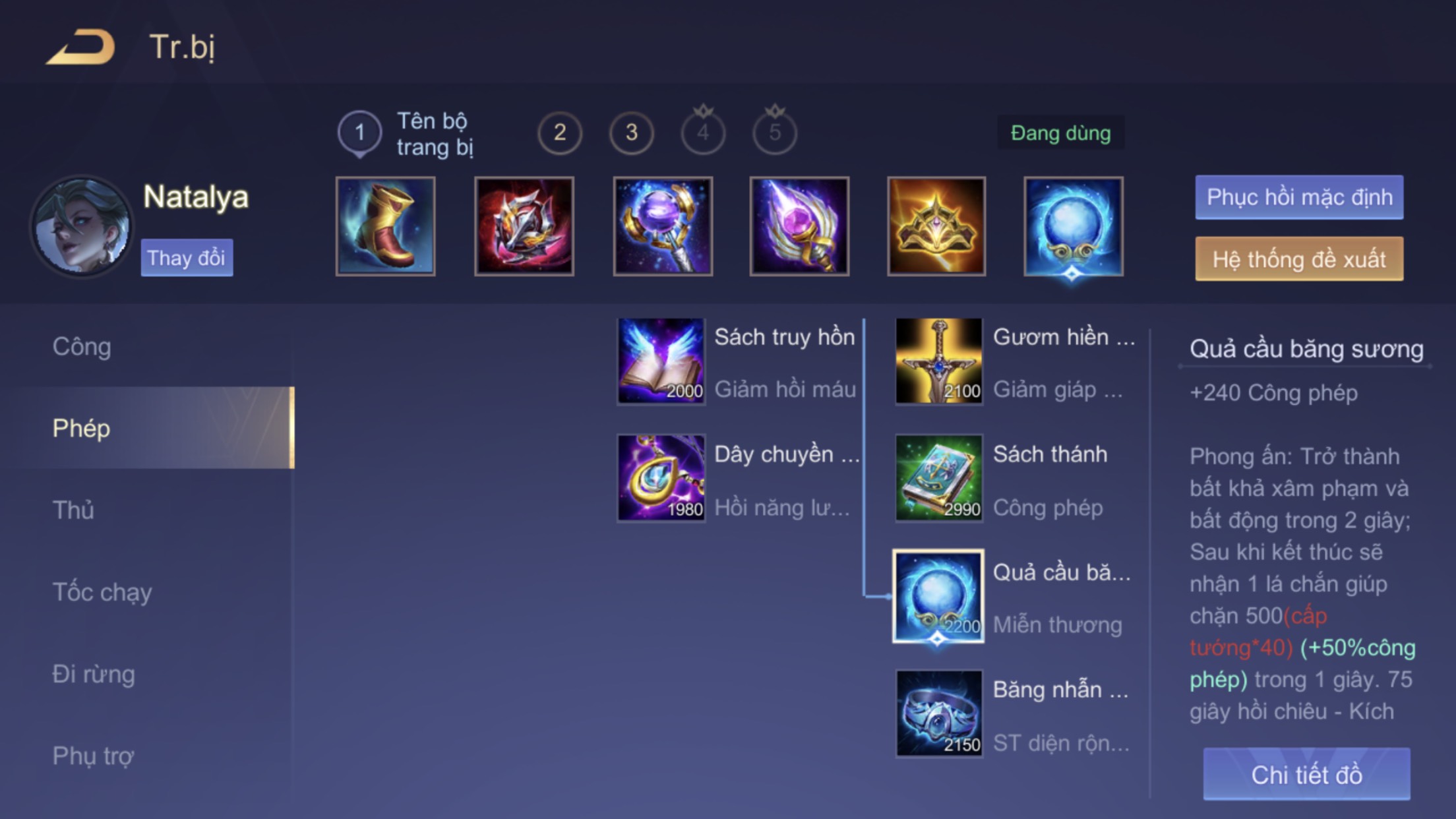 Bạn có thể tham khảo lối lên trang bị cho Natalya ở mùa giải 21 này như sau: Giày Thuật Sĩ, Mặt nạ Berith, Quyền trượng Rhea, Trượng Hỗn Mang, Vương Miện Hecate và Quả Cầu Băng Sương.