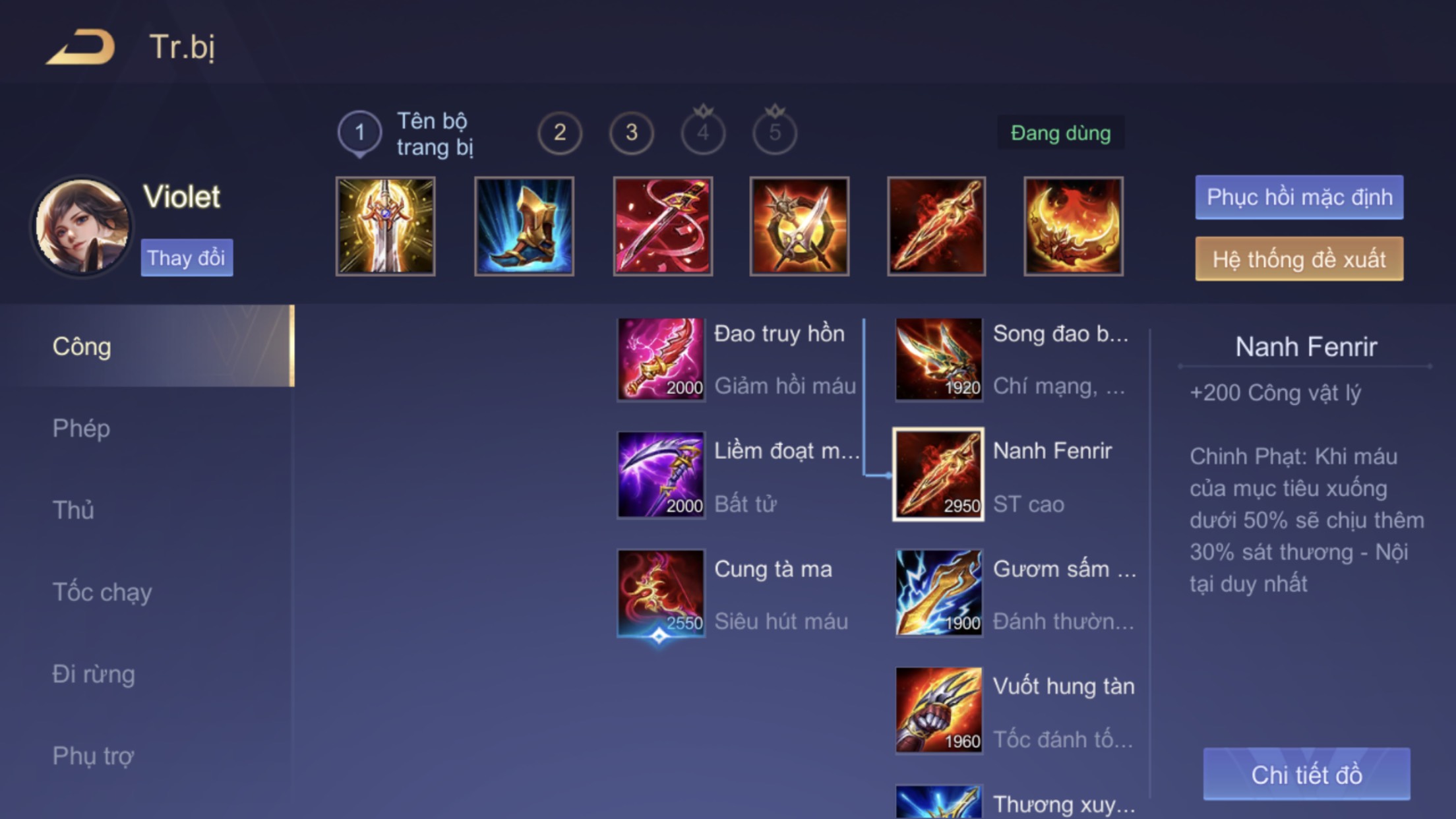 Game thủ có thể tham khảo lối lên đồ dành cho Violet đi đường với Giày Kiên Cường, Thánh Kiếm, Kiếm Muramasa, Phức Hợp Kiếm và Giáp Hộ Mệnh. Nếu muốn kẻ địch 'khô máu' nhanh chóng, bạn có thể thay thế Phức Hợp Kiếm bằng Nanh Fenir để có thể sốc sát thương triệt để hơn.