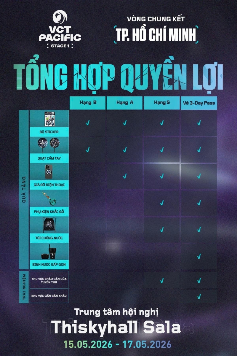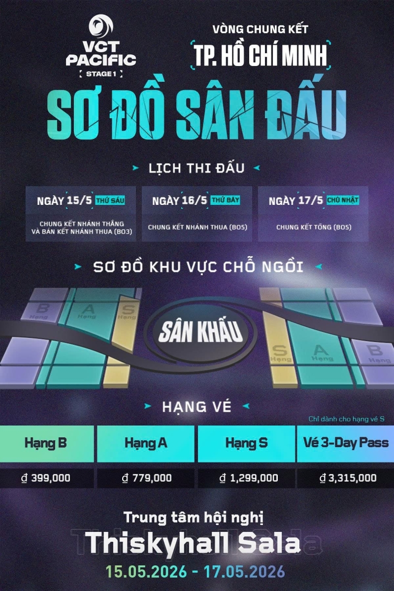 Sau khi giải đấu Masters Santiago khép lại, VCT 2026 Pacific Stage 1 đã chính thức khởi tranh từ ngày 03/04. Đặc biệt, vòng Chung kết sẽ được tổ chức tại Trung tâm Hội nghị Thiskyhall Sala, TP HCM. Đây là địa điểm hiện đại, chuyên phục vụ các sự kiện quy mô lớn, hứa hẹn mang đến không gian thi đấu chuyên nghiệp và bùng nổ. Tại đây, những đội tuyển xuất sắc nhất khu vực sẽ bước vào cuộc cạnh tranh gay cấn để giành ngôi vô địch Stage 1.